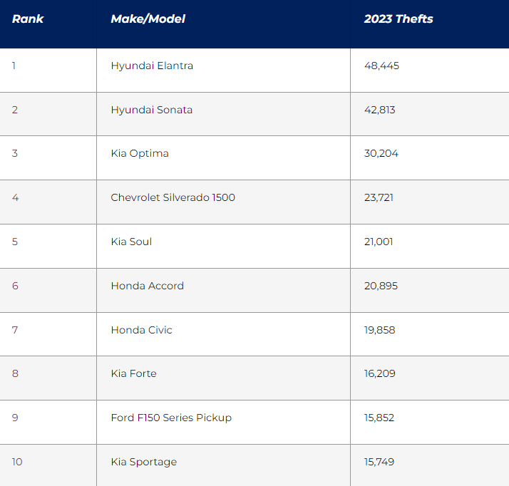 Did you know in 2023, Kia and Hyundai vehicle models were stolen at an alarming rate (see chart below). The companies dominated (6) of the top ten spots.